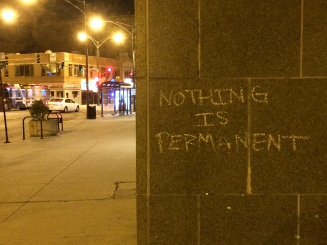 Right after arriving in Chicago, I realized I’d lost everything that ever mattered to me — family, career, money, goals, the mere ability to dream, let alone dreams themselves. Everything but writing and friends. It was strangely comforting: the simplicity, an entire life just ink in a journal and friends cracking wise. And if you’re looking for the very-special-episode-of-Oprah part of this thing, here it is: there was also another element to this simplicity: the fact of survival.
